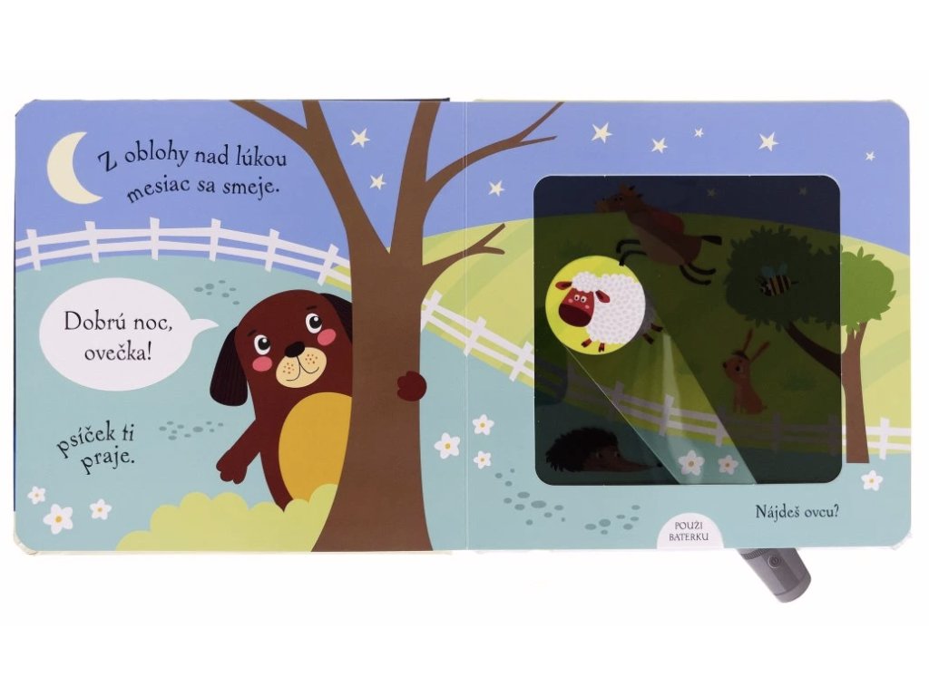 Pomôž psíkovi pomocou kúzelnej baterky nájsť všetkých jeho zvieracích kamarátov ukrytých v knižke. Čítanie vo veršoch, ideálne do postieľok.