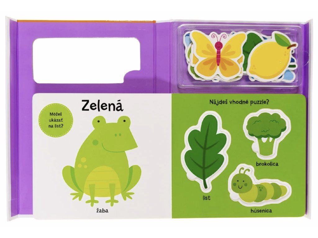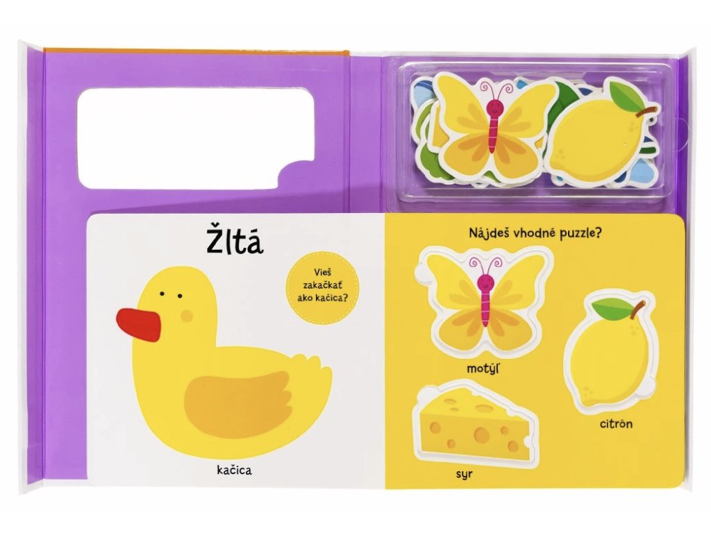 Táto veselo ilustrovaná knižka zoznámi najmenšie deti so svetom farieb aj so zvieratkami, jedlom či napríklad dopravnými prostriedkami. Okrem 12 puzzle, vďaka ktorým deti budú rozvíjať a trénovať jemnú motoriku, čakajú na malých zvedavcov aj otázky a úlohy, ktoré im pomôžu, aby si nové znalosti a už nadobudnuté vedomosti precvičili a lepšie tak osvojili. S knižkou aj puzzle sa vaše deti rozhodne nudiť nebudú a strávia s nimi celé hodiny hier a učenia.