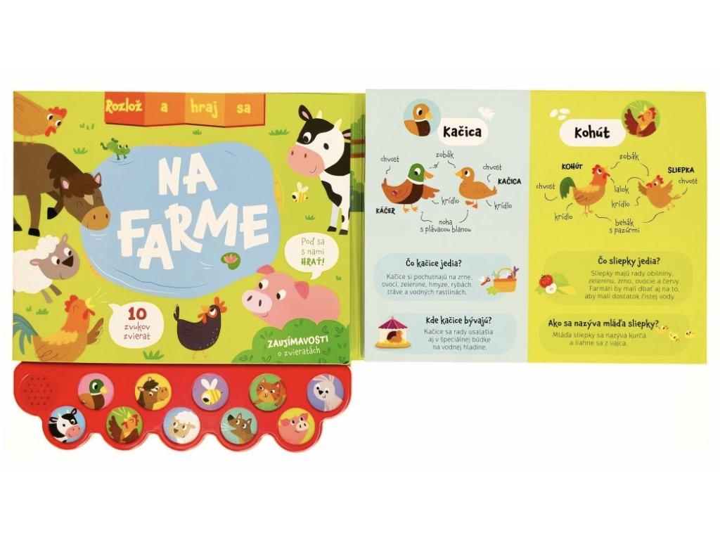Toto zvukové rozkladacie leporelo prináša malým čitateľom fascinujúci svet domácich a hospodárskych zvierat. Spoznajte kone, kravy, ošípané, včely a ďalších obyvateľov, vypočujte si autentické zvuky zvierat a zoznámte sa s ich zaujímavými vlastnosťami a so životom na farme. Stlačte tlačidlo a započúvajte sa do zvukov zvierat aj veselých melódií. Rozvíjajte jemnú motoriku pri hľadaní a počítaní zvieratiek alebo objavujte príbehy z farmy vďaka bohatým ilustráciám a aktivitám na každej stránke. Rozkladacia knižka navyše podporuje predstavivosť, myslenie a muzikálne cítenie.